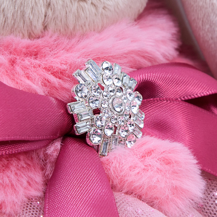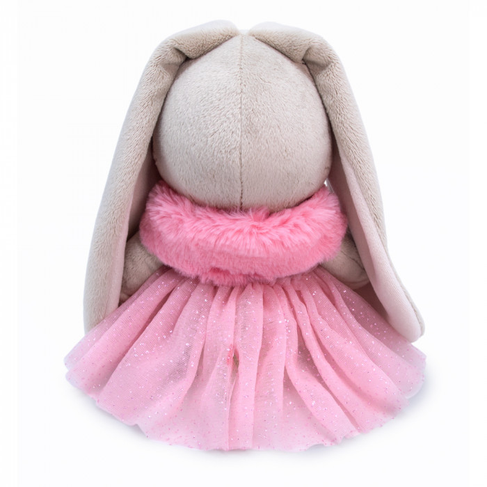 На Зайке Ми милый комплект в воздушных розовых тонах. Легкая, пышная юбочка из тонкой сеточки с серебристым блеском. Меховая горжетка с атласным бантом, середину которого украшает шикарная серебристая пуговица-брошь с кристаллами.