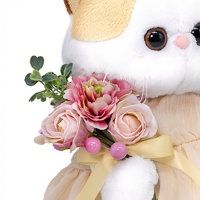 На Ли‑Ли нежнейшее платьице нюдового цвета. В лапках Ли‑Ли держит букетик нежных цветов, перевязанных атласной лентой.