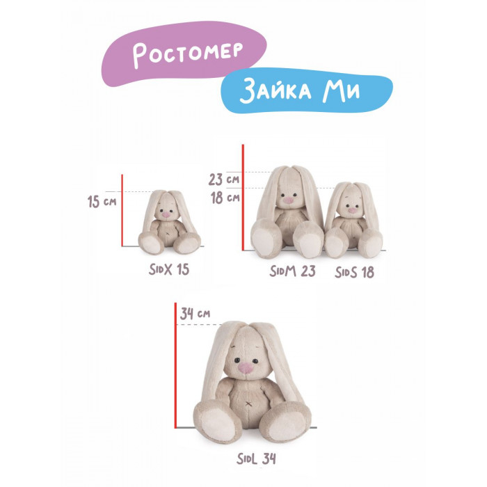 Зайки Ми - это два ушастых близнеца Мика и Мия (мальчик и девочка). Они первыми появились в коллекции BUDI BASA. Мика и Мия похожи друг на друга, как две пуговки на рубашке. Но у Мика есть отличительный галстук-бабочка. Зайки Ми выпускаются в разных размерах от 15 см до 35 см. Лапы могут быть мягкими (тогда игрушка сидячая), либо твердыми (тогда игрушка устойчивая).