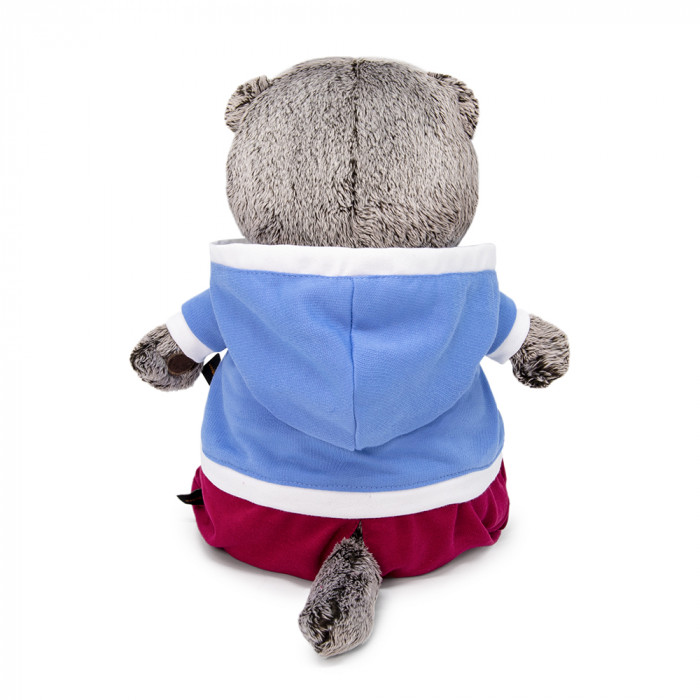 На Басике яркий комплект в спортивном стиле. Свободные штанишки из х/б футера гранатового цвета. Рубашка поло с капюшоном из бело‑голубого х/б футера. Спереди на рубашке контрастная нашивка в виде летящей ракеты.