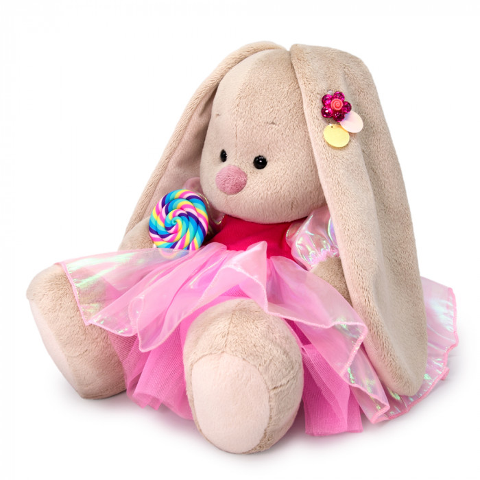 Зайка в нарядном платье с пышной двойной юбочкой. Нижняя юбочка сшита из розовой марлевки, верхняя - из тонкой ткани цвета розового сахара с отливом. На ушке у Зайки - цветочек с пайетками, а в лапках она держит полосатую карамельку на палочке.