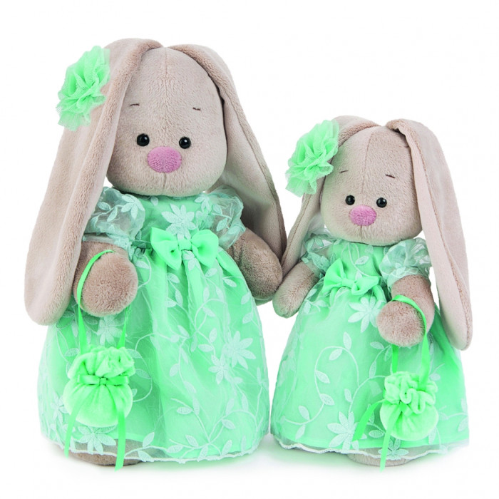 заворожит палитрой красок, роскошью тканей, изящностью аксессуаров.Лёгкое платье цвета нежной мяты с рукавом-фонарик, из тончайшей ткани с вышивкой в тон. Платье украшено бантом из шёлка. В лапках Зайка держит сумочку из бирюзового бархата с атласным бантиком. На ушке украшение - цветок из бирюзовой сеточки.