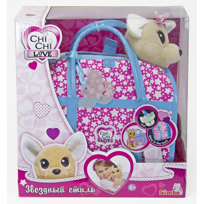 Сияет ярче, чем звезда! Плюшевая собачка ChiChiLove "Звездный стиль" в яркой розовой сумочке с астрономическим принтом в виде тысячи звезд! Сама собачка нарядилась в розовую футболку, а ее ушки украшает забавный бантик. У собачки необычная подвеска, которую можно повязать на шею - она светится в темноте. Ведь ЧиЧиЛав готова блистать всегда и везде!