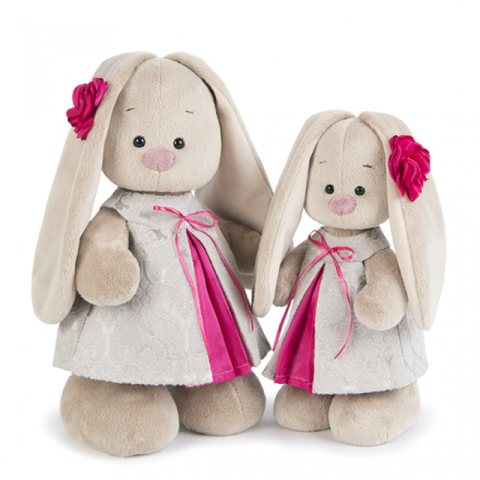 Зайка в нарядном платье из жаккарда благородного серебристо-серого цвета. Спереди платье украшает оригинальная вставка из шелковистого сатина цвета фуксии и ярко-розовый бантик из узкой атласной ленты. На ушке у Зайки шелковая розочка сочного малинового цвета.