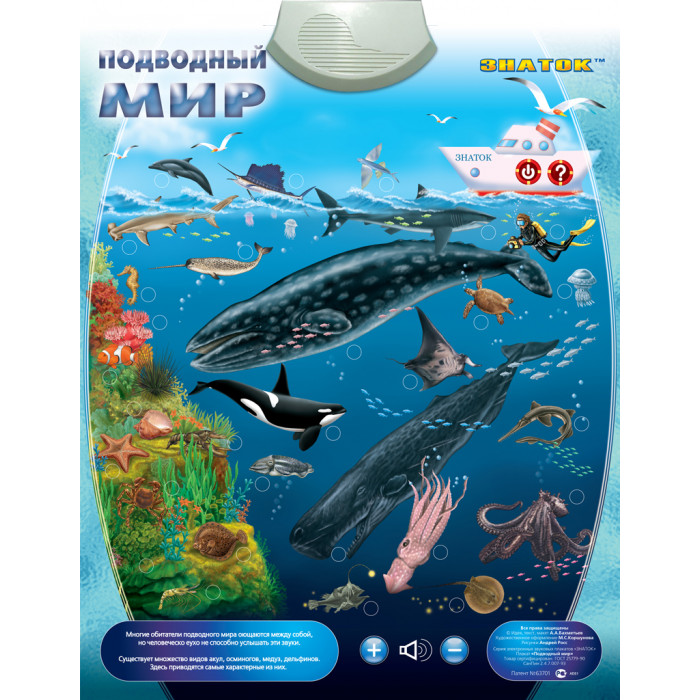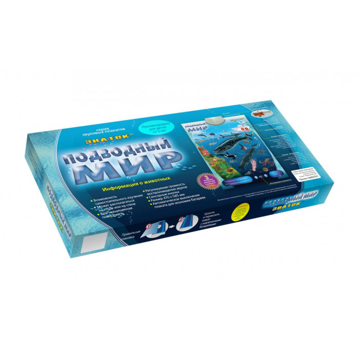 Звуковой плакат знакомит детей с наиболее характерными обитателями морей и океанов: осьминогом, акулой, дельфином, кальмаром и другими. Возле каждого животного находится кнопка, нажав на которую, ребёнок сможет послушать информацию о морском обитателе и услышать, какие звуки он издаёт.