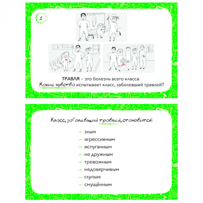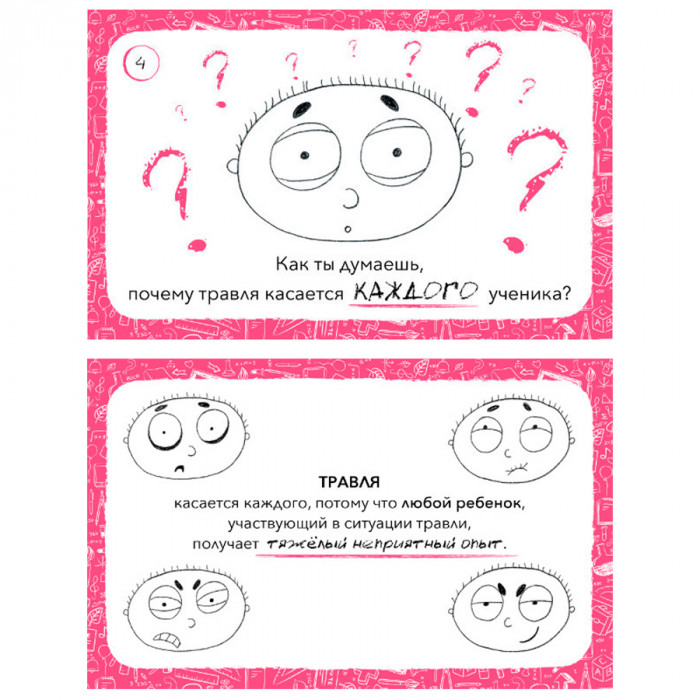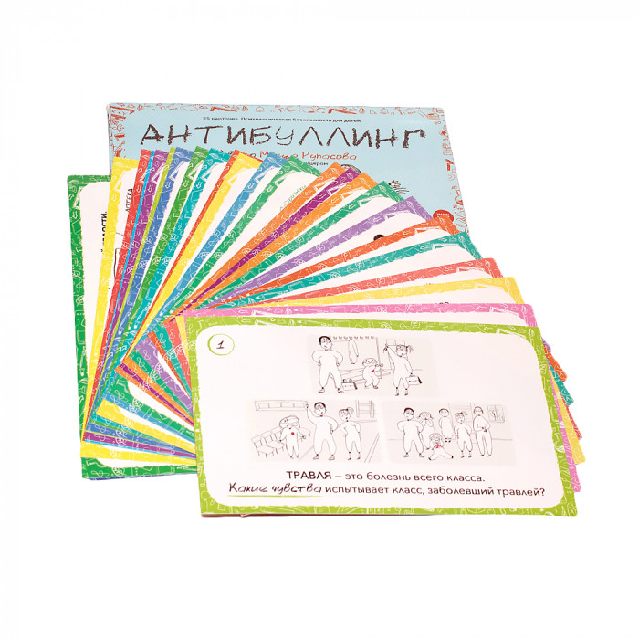 Что такое "Антибуллинговые карточки" и зачем они ребенку? Отвечая на вопросы и выполняя задания на карточках, ваш ребенок разовьет критическое мышление, узнает, что такое школьная травля и как отличить ее от конфликта, научится противостоять агрессии и манипуляциям со стороны сверстников.