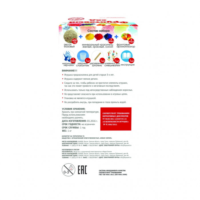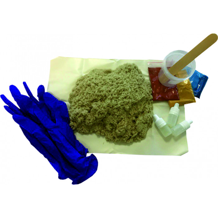 Трогательный песок на 90% состоит из обычного кварцевого песка, и на 10% из связующего полимера, который и придает ему его волшебные физические свойства. Так же используется безопасная антисептическая добавка, которая не дает развиваться бактериям в песке.