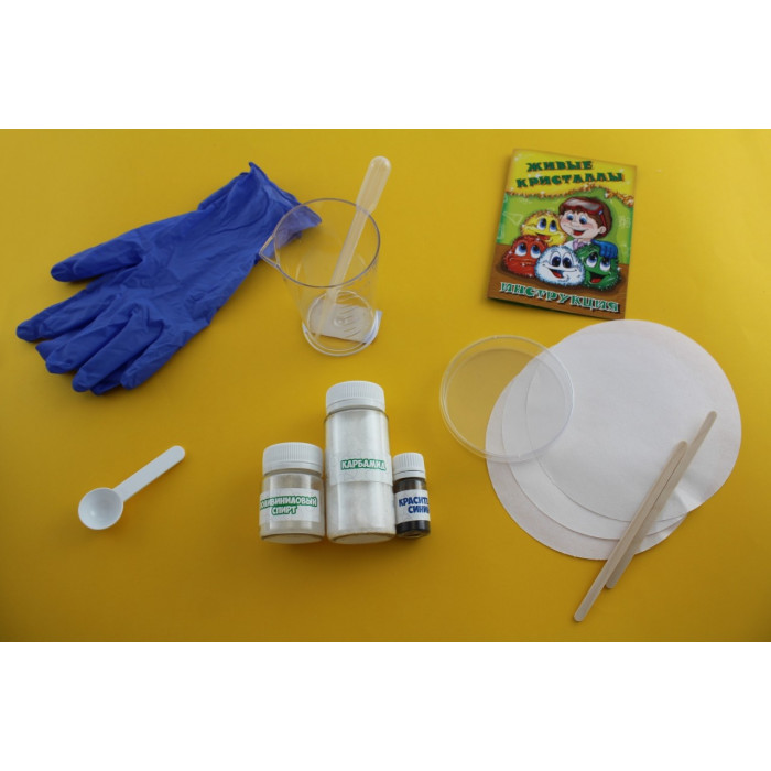 Добавьте в стакан с раствором карбамида 2 мл поливинилового спирта и тщательно размешайте. Для более интенсивного роста кристаллов добавьте 1–2 капли жидкого средства для мытья посуды (в набор не входит).