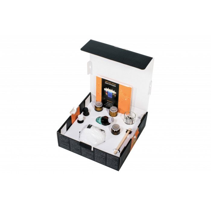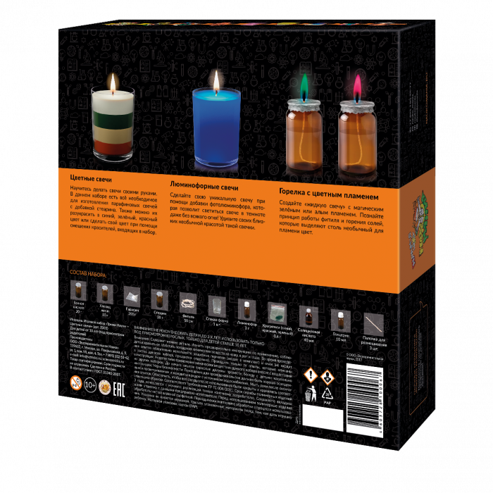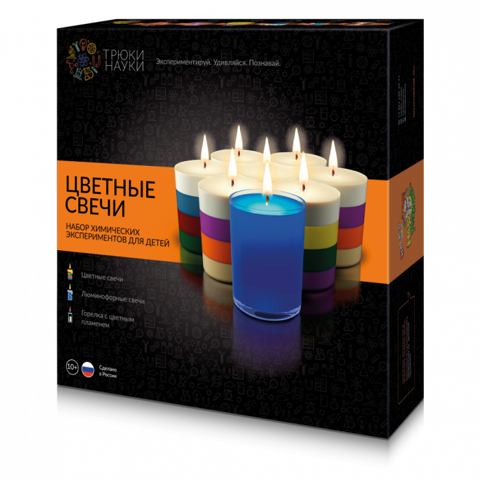 Набор химических экспериментов для детей, в который входит 3 разных опыта, каждый из которых можно создавать многократно : "Цветные свечи" научит изготовлять красивые парафиновые свечи, которые можно разукрасить в различные цвета: синий, зеленый, красный цвет и даже выдумать и сделать свой цвет при помощи смешивания красителей, входящих в набор; "Люминофорные свечи" Вы можете удивить близких и сделать уникальную свечу, добавив в состав свой секрет- фотолюминофор, который будет светиться в темноте без всякого огня, наполняя дом уютом и атмосферой волшебства. "Горелка с цветным пламенем" создавайте свои "жидкую свечу" с магическим зеленым или алым пламенем.