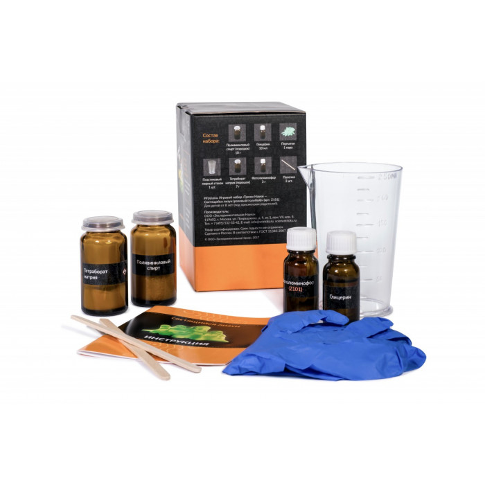 Набор химических экспериментов для детей: "Светящийся лизун" при свете дня - розовый, в темноте светиться голубым. Реагентов хватает на несколько исполнений.