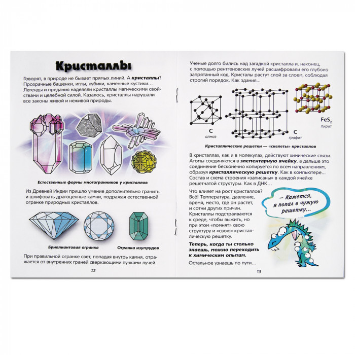 В набор также входит книга-инструкция, из которой вы узнаете много нового и интересного о кристаллах и минералах.