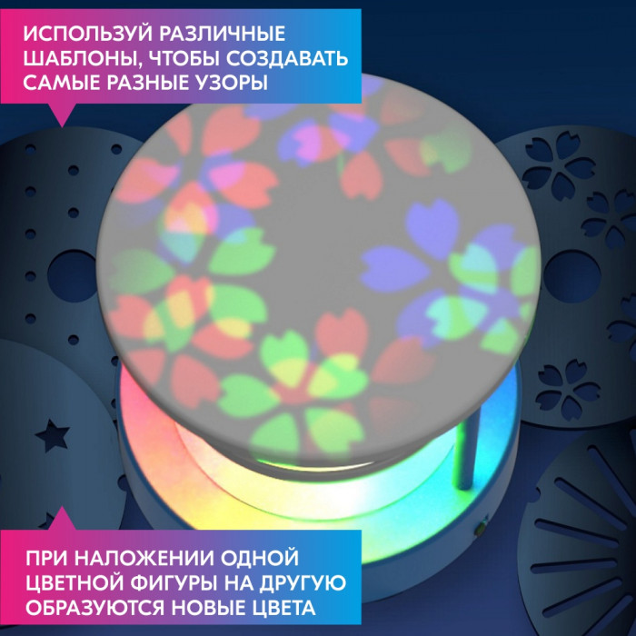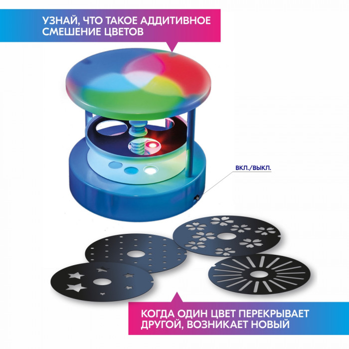 Основной шаблон с тремя отверстиями наглядно показывает, как цвета сходятся вместе, создавая новые цвета. Свет от светодиодных фонарей проходит сквозь отверстия и попадает на экран, образуя разноцветные круги. Когда два круга перекрывают друг друга, цвета сливаются, создавая новые сочетания, например красный + синий = маджента. Этот эффект называется аддитивным смешением цветов.