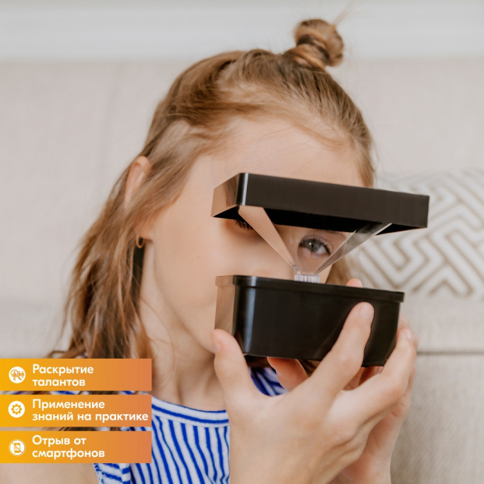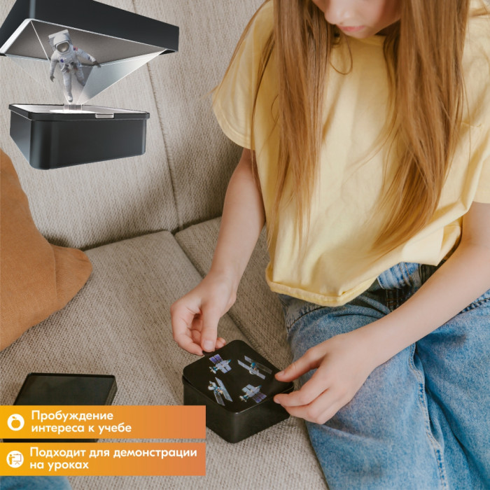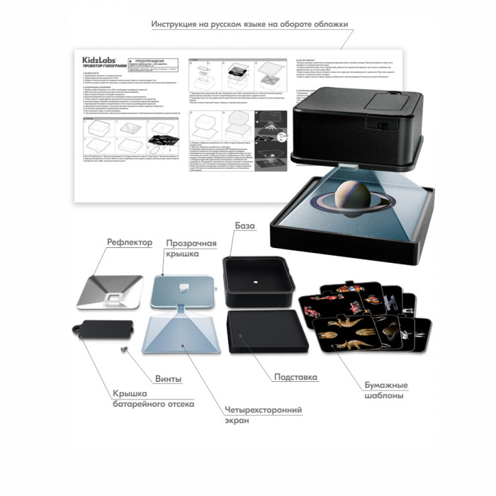 Голографический эффект, примененный в этом устройстве, иногда используется в театрах для того, чтобы на сцене появился призрак. Стеклянный экран перед сценой отражает актера, который скрывается под сценой. Этот прием называется "призрак Пеппера" в честь его изобретателя Джона Пеппера. Еще больше интересных фактов о голограммах вы найдете в инструкции к набору.