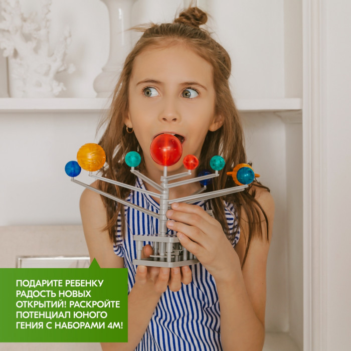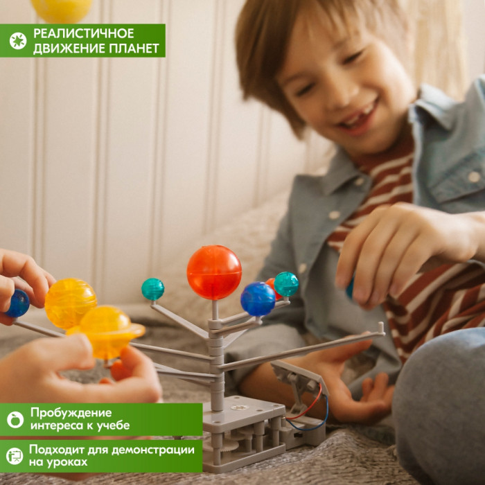 Наш мини-планетарий — пример механической модели Солнечной системы Оррери. В макете все планеты движутся вокруг Солнца с одинаковой скоростью. На самом деле у каждой планеты своя скорость. Еще больше интересных фактов вы найдете в инструкции к набору 4М.