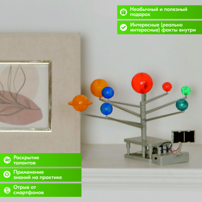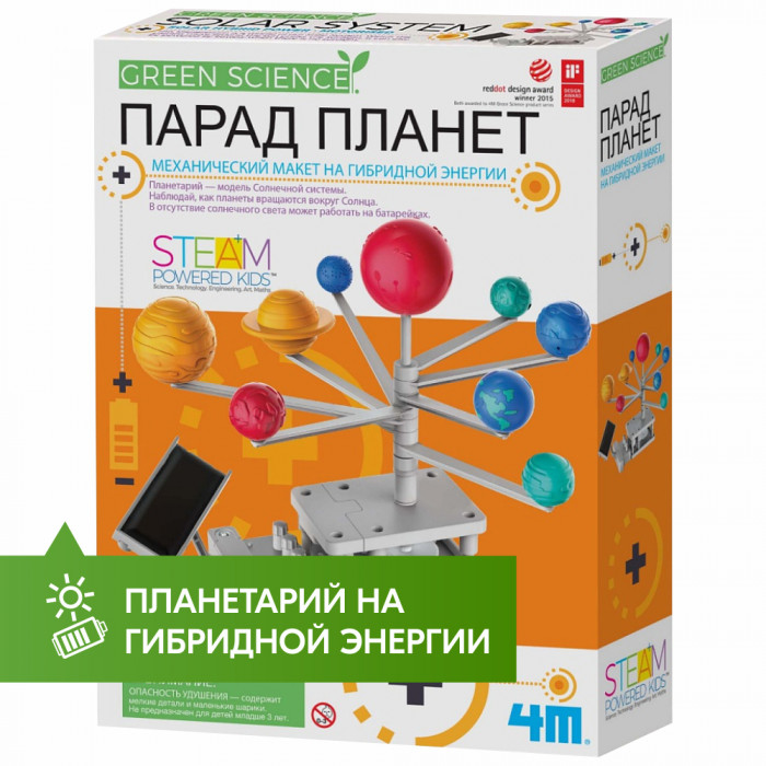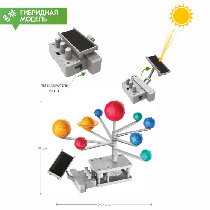 Самодельный парад планет! Соберите своими руками механический макет, работающий на гибридной энергии. Наблюдайте, как планеты вращаются вокруг Солнца. В отсутствие солнечного света макет может работать на батарейках.