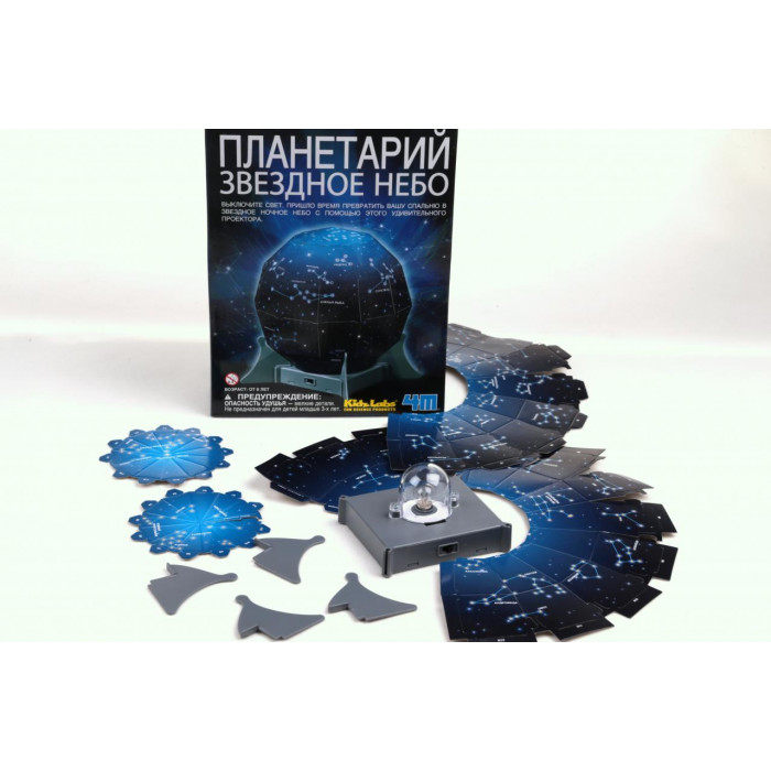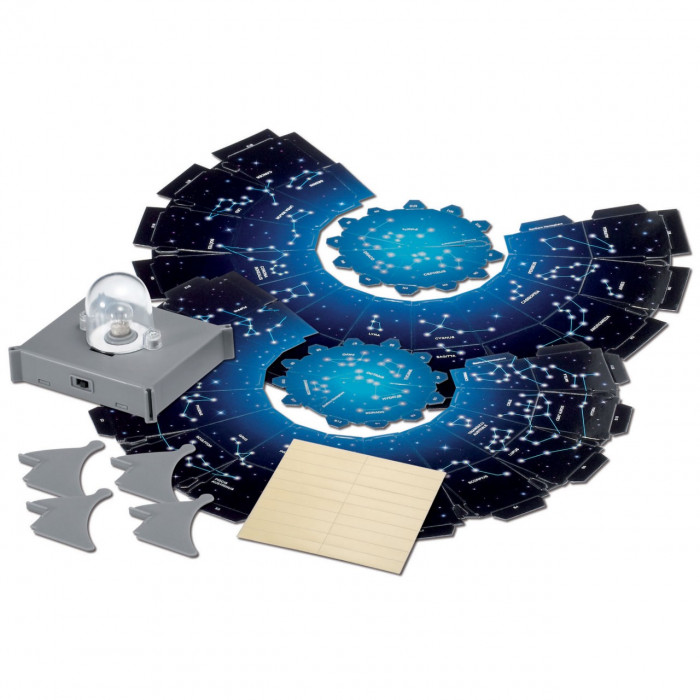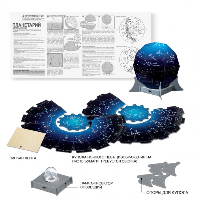 В набор вошли заготовки для сборки домашнего планетария, а также звездные карты северного и южного полушарий. Весь процесс изготовления сопровождается подробными инструкциями на русском языке. Соберите все детали воедино и наблюдайте, как ваша комната наполнится загадочным светом далеких созвездий.