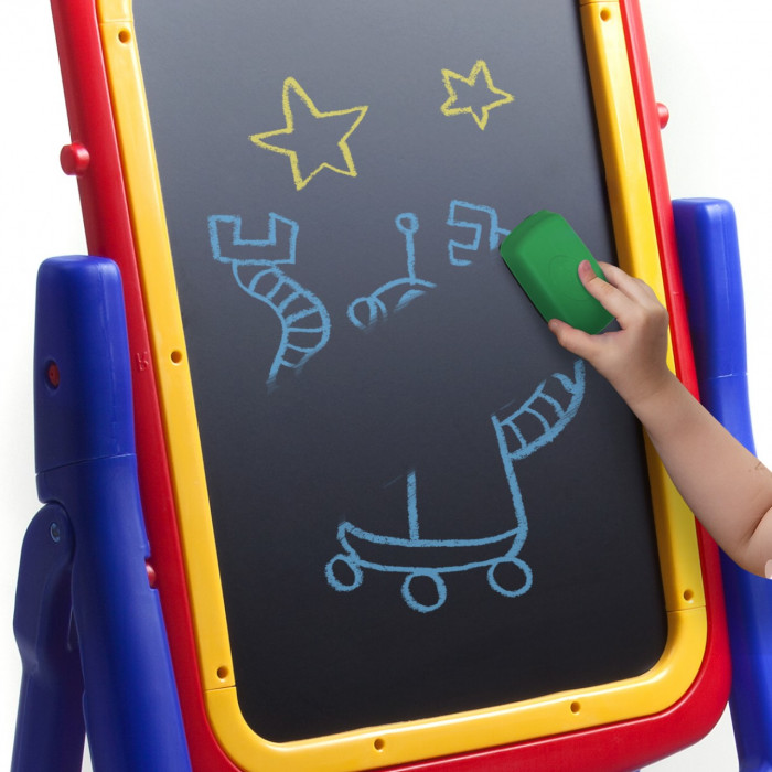 Рисовать на мольберте можно с двух сторон. Одна его сторона белая и магнитная. На ней можно рисовать фломастерами и очищать место специальной резинкой, складывать слова из букв-магнитиков и учиться счету с помощью разноцветных цифр-магнитов. Вторая сторона доски — грифельная. Здесь малыш может рисовать мелками.