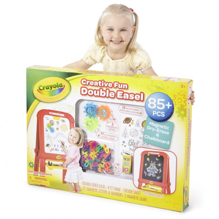 Напольный мольберт 3 в 1 имеет 2 поверхности: черная грифельная - для рисования мелом, белая магнитная - может использоваться для размещения букв и цифр на магнитах, а также рисования маркером.
