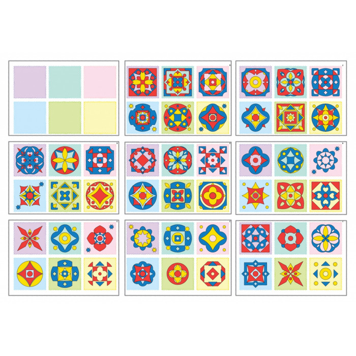 Набор "Орнаменты" - это комплект из трёх игр для развития для развития логики, образного мышления, внимания и восприятия цвета. В него входят: 9 картонных двухсторонних карт с орнаментальными рисунками, 54 прозрачные пластиковые карточки в мешочке, блокнот с творческими заданиями и набор цветных восковых мелков.