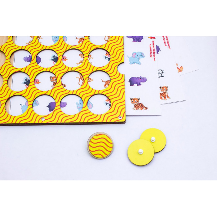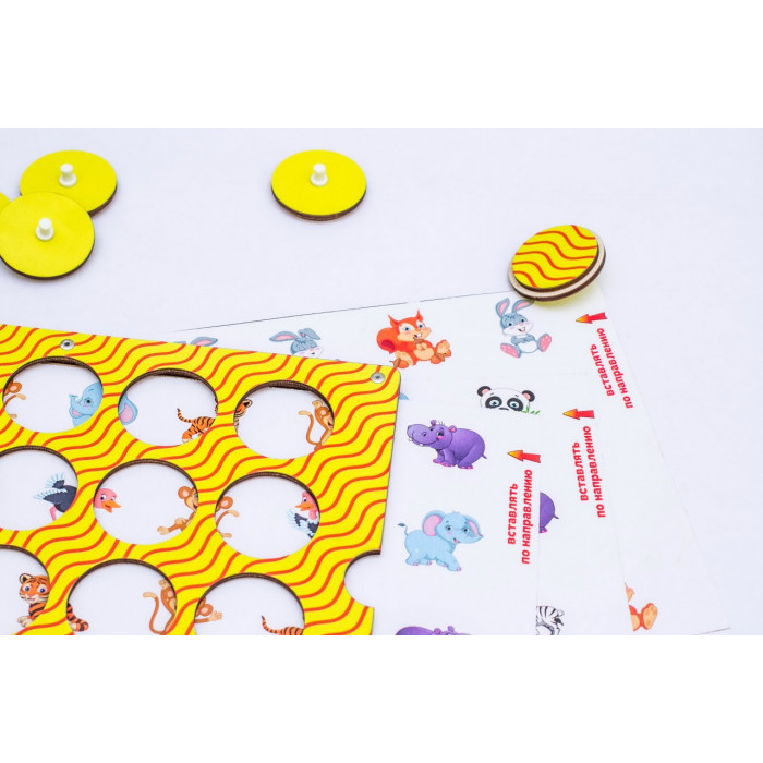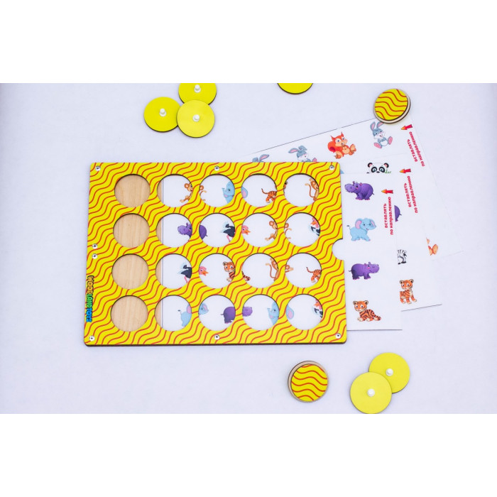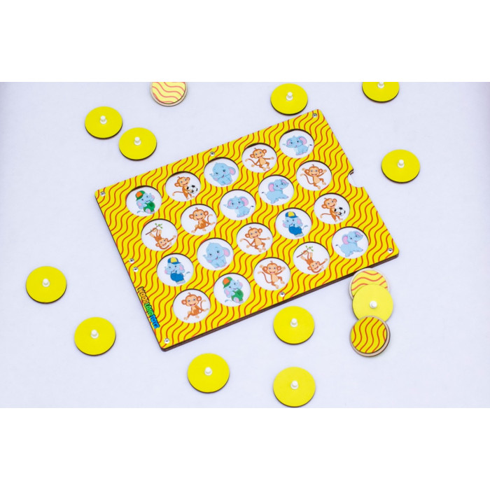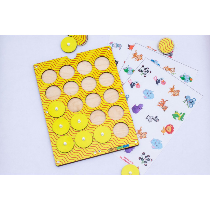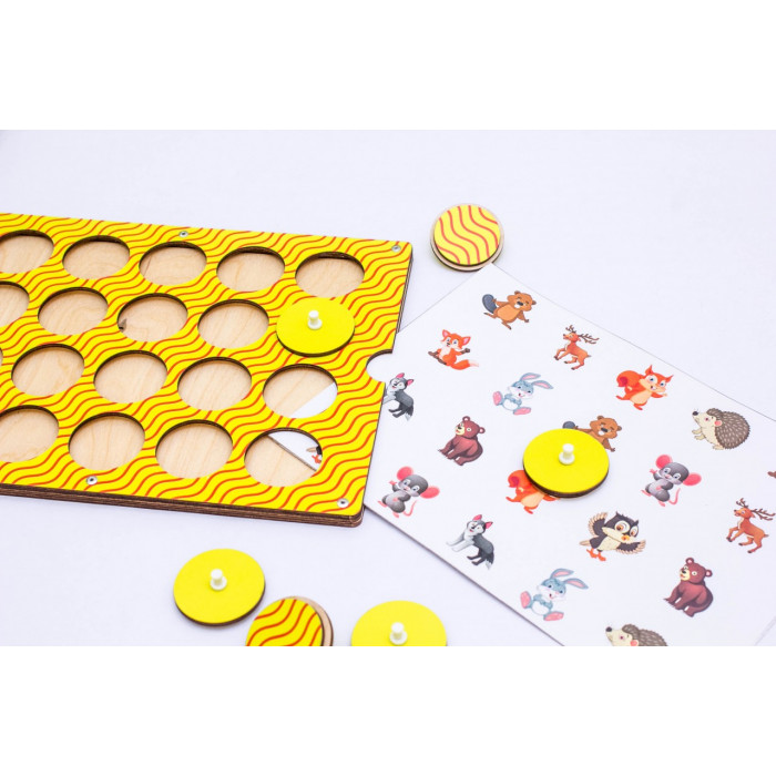 Игрушка представляет собой красочный деревянный планшет с 20 крышками с удобными держателями и 3 двухсторонних листа с наборами парных изображений. Листы составлены по уровню сложности от простого к сложному.