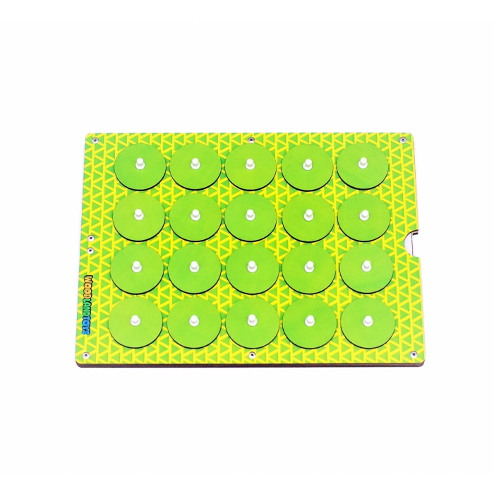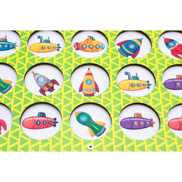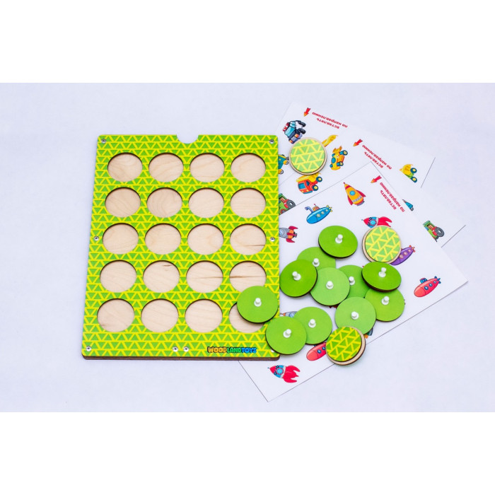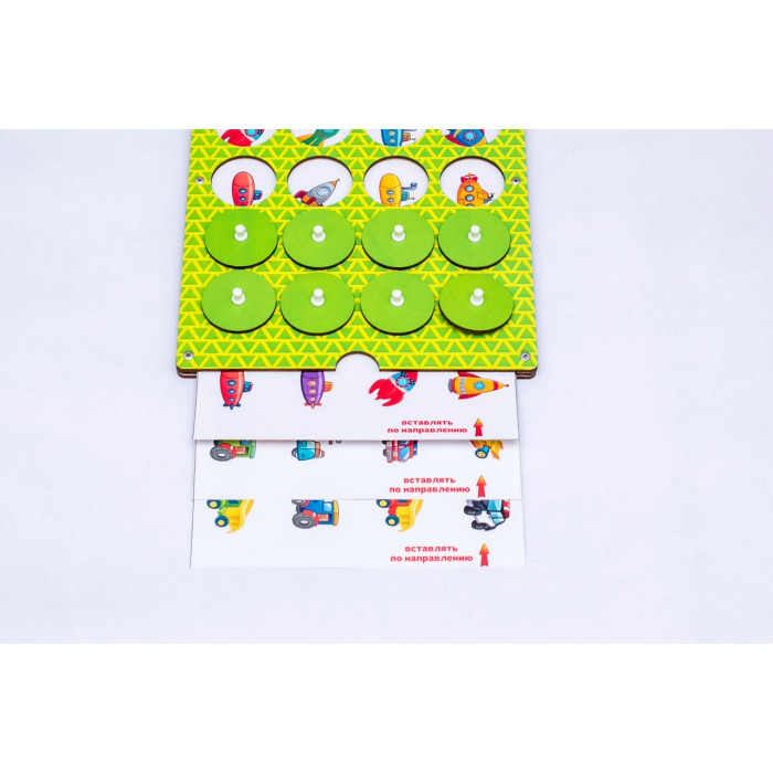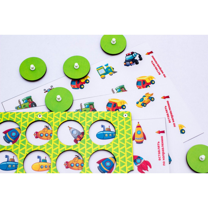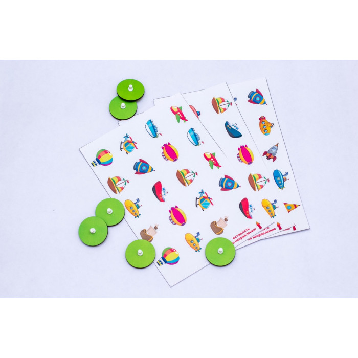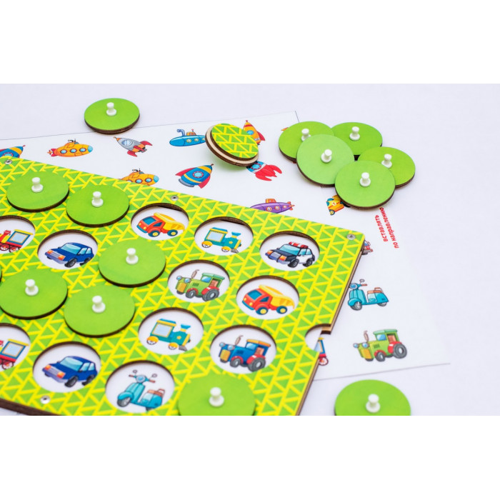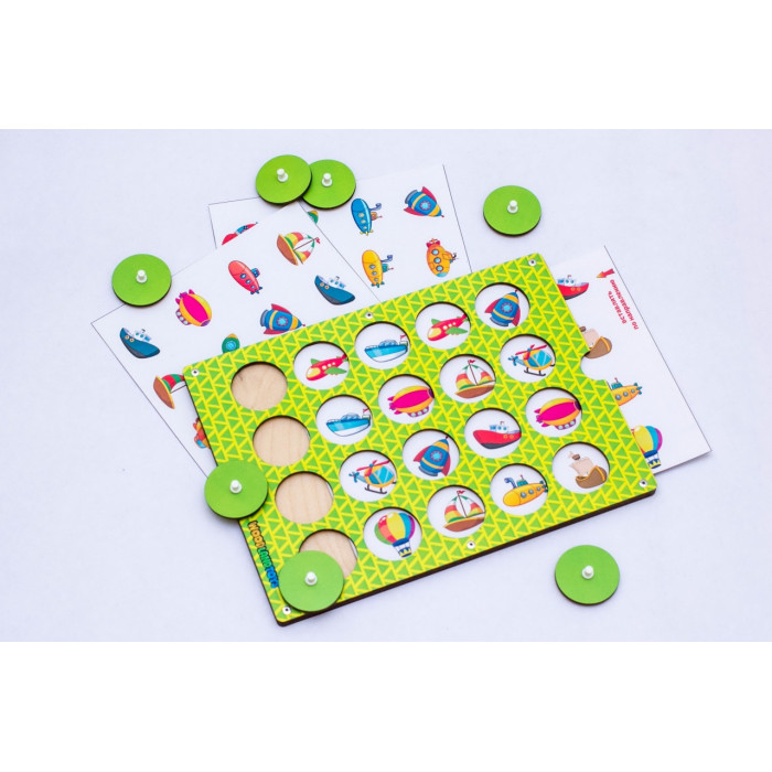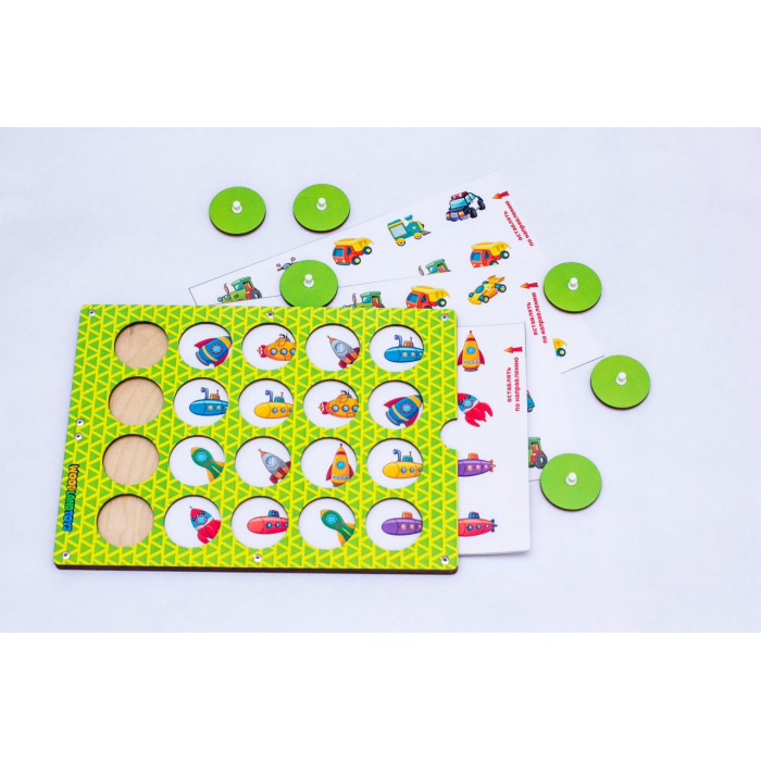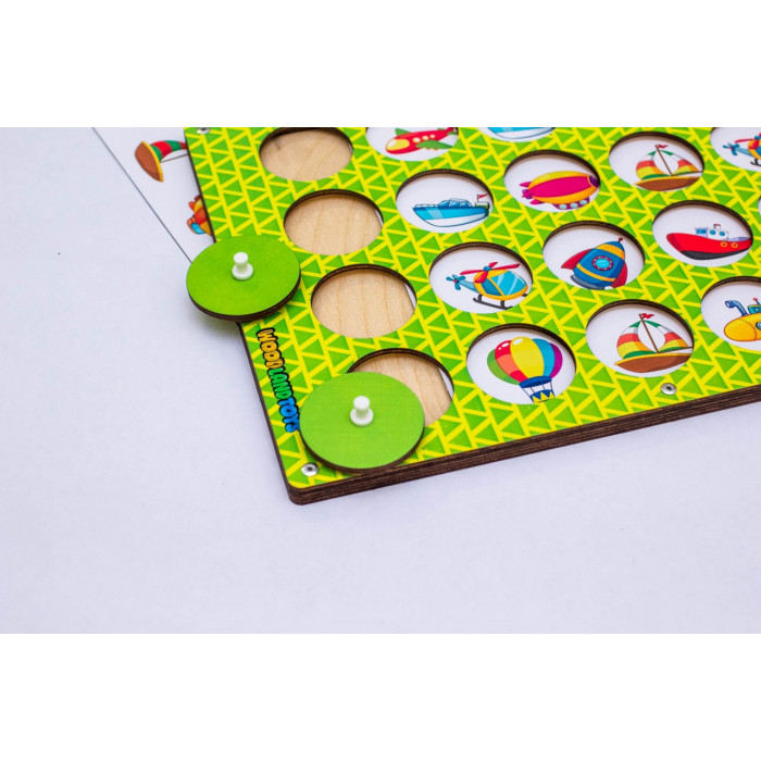 Игрушка представляет собой красочный деревянный планшет с 20 крышками с удобными держателями и 3 двухсторонних листа с наборами парных изображений. Листы составлены по уровню сложности от простого к сложному.
