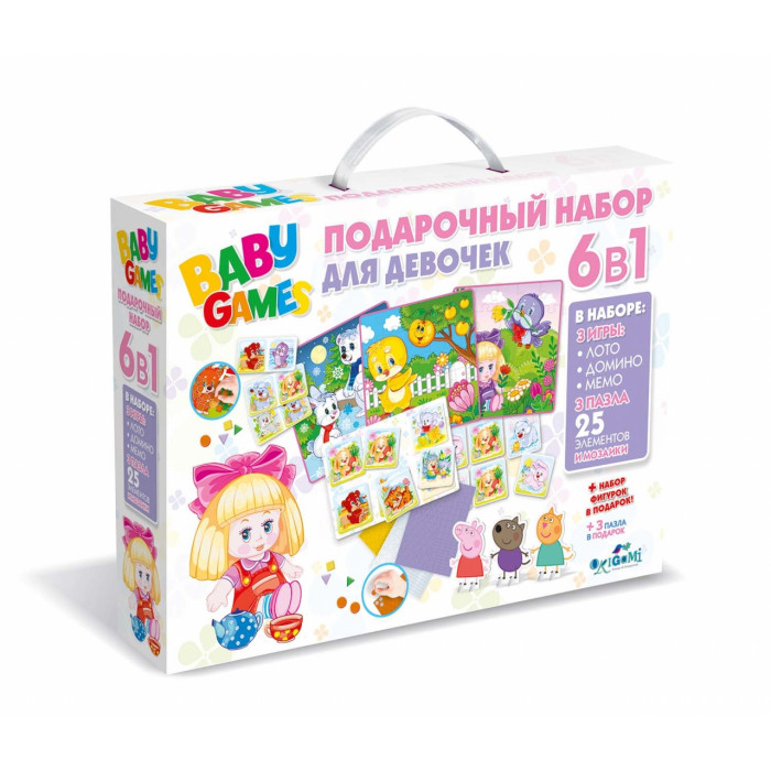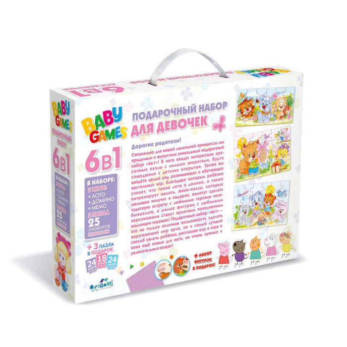 Подарочный набор 6 в 1 для девочек - это уникальный набор, включающий в себя интересные красочные пазлы с милыми зверятами, будто сошедшими в детских открыток, а также целый ряд развивающих и обучающих настольных игр, благодаря которым ребенок узнает, что такое лото и домино, а также потренирует память.
