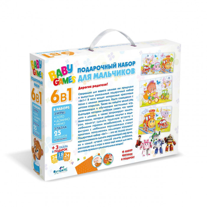 Подарочный набор 6 в 1 для мальчиков — это уникальный набор, включающий в себя интересные красочные пазлы с милыми зверятами, будто сошедшими в детских открыток, а также целый ряд развивающих и обучающих настольных игр, благодаря которым ребенок узнает, что такое лото и домино, а также потренирует память.