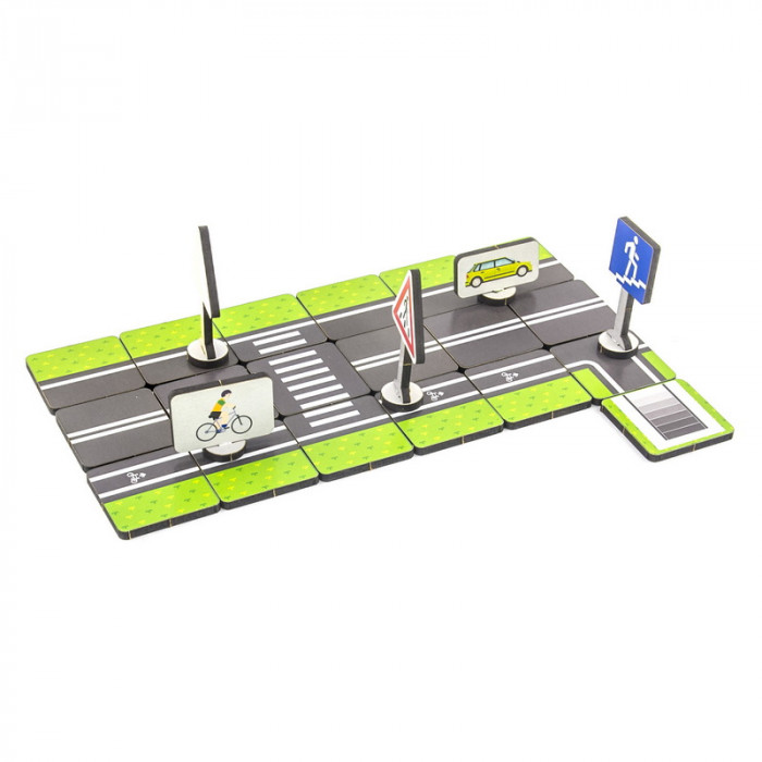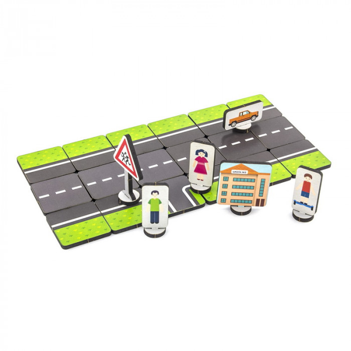 Игрушка представляет собой набор деталей для конструирования дорог и комплект фигурок с изображениями людей, транспортных средств, домов и других объектов инфраструктуры.