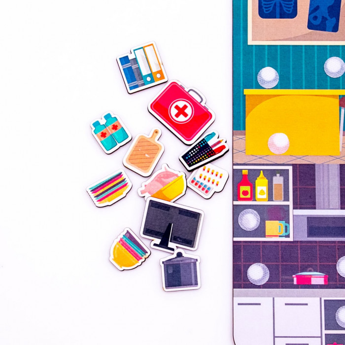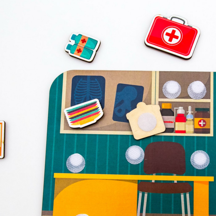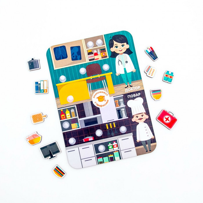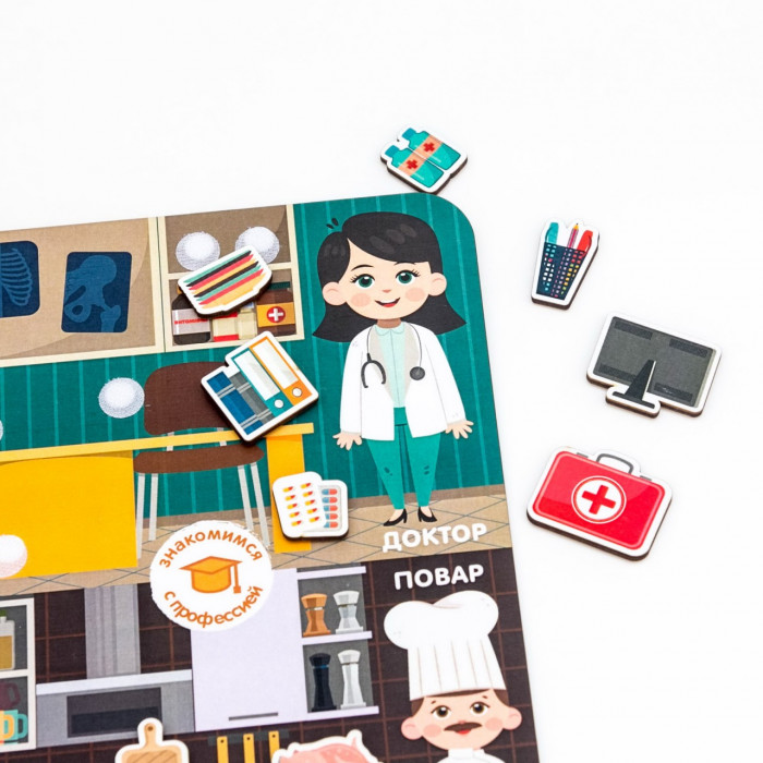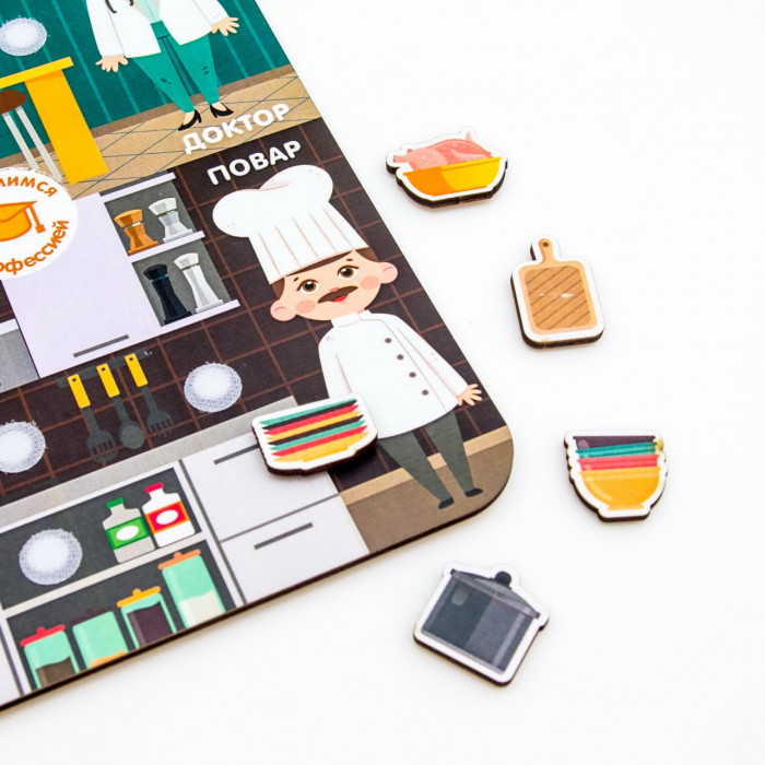 Игра с сортером "Профессии", с одной стороны, очень проста — нужно прилеплять и отлеплять на доске фигурки. А с другой стороны, ребенку сначала потребуется подробно познакомится со всеми изображениями, найти место каждой фигурке и только потом прикрепить ее на соответствующее тематическое поле.