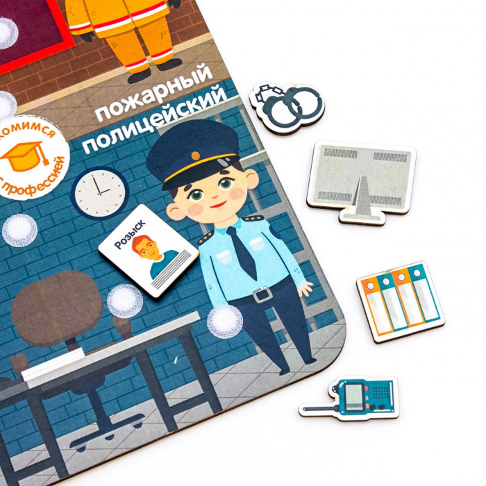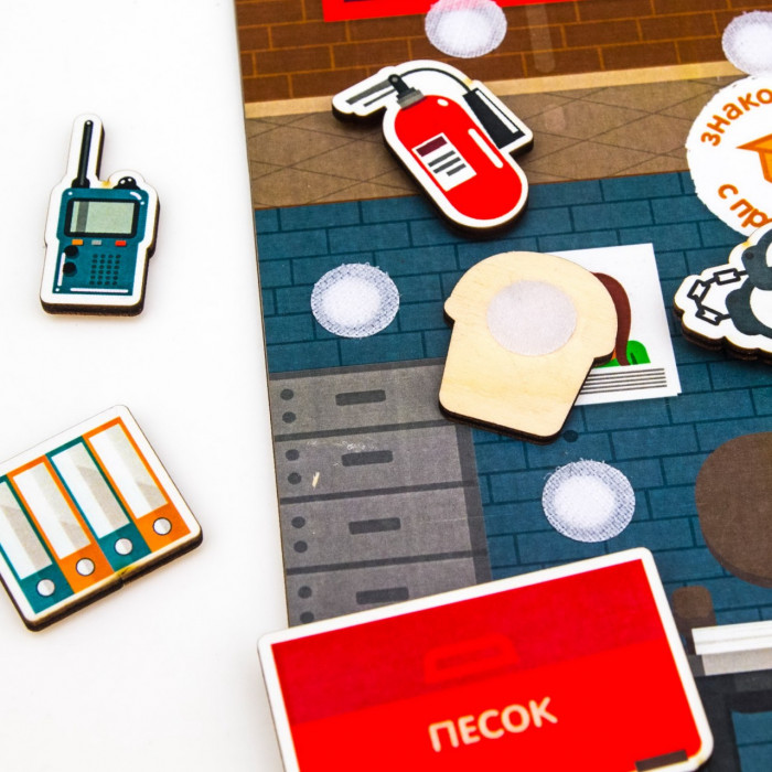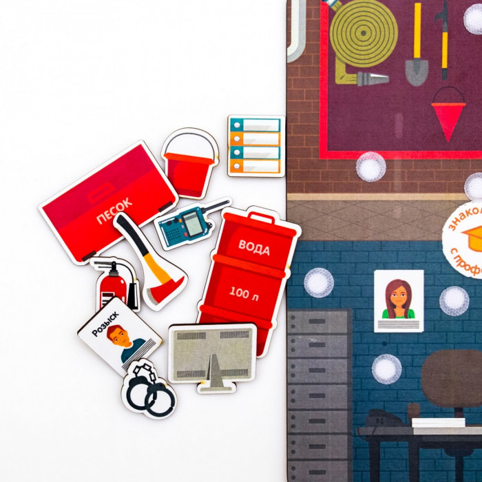 Игра с сортером "Профессии", с одной стороны, очень проста - нужно прилеплять и отлеплять на доске фигурки. А с другой стороны, ребенку сначала потребуется подробно познакомится со всеми изображениями, найти место каждой фигурке и только потом прикрепить ее на соответствующее тематическое поле.