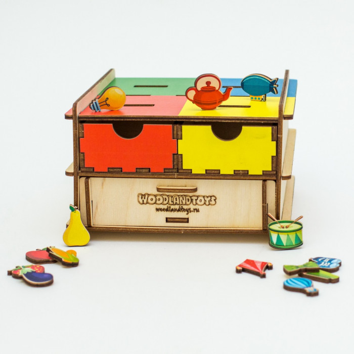 Задача ребенка — раскладывать фигурки по соответствующим местам на плашках или вставлять фигурки в специальные прорези на корпусе комодика, группируя по цвету, форме или изображению.