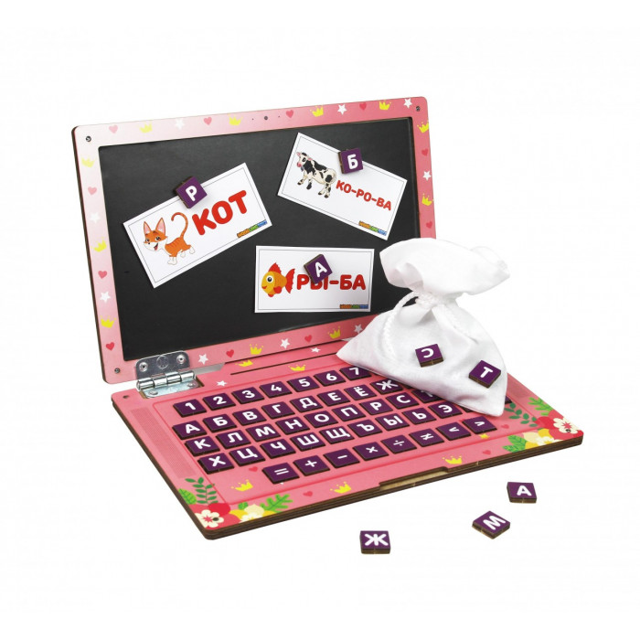 Игрушка представляет собой конструкцию в виде переносного персонального компьютера, имеет дисплей - магнитную доску и клавиатуру с вкладышами-кнопками.