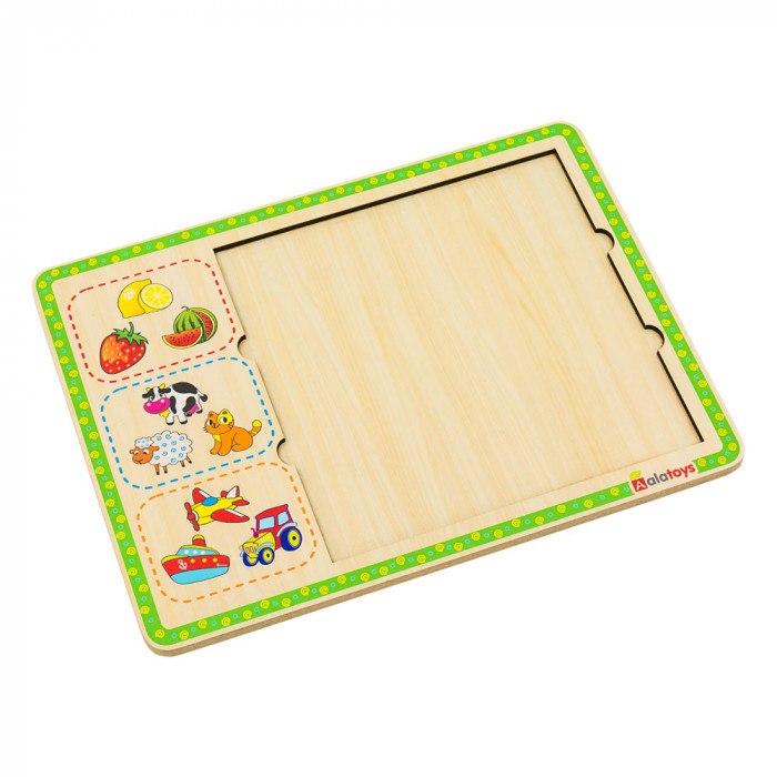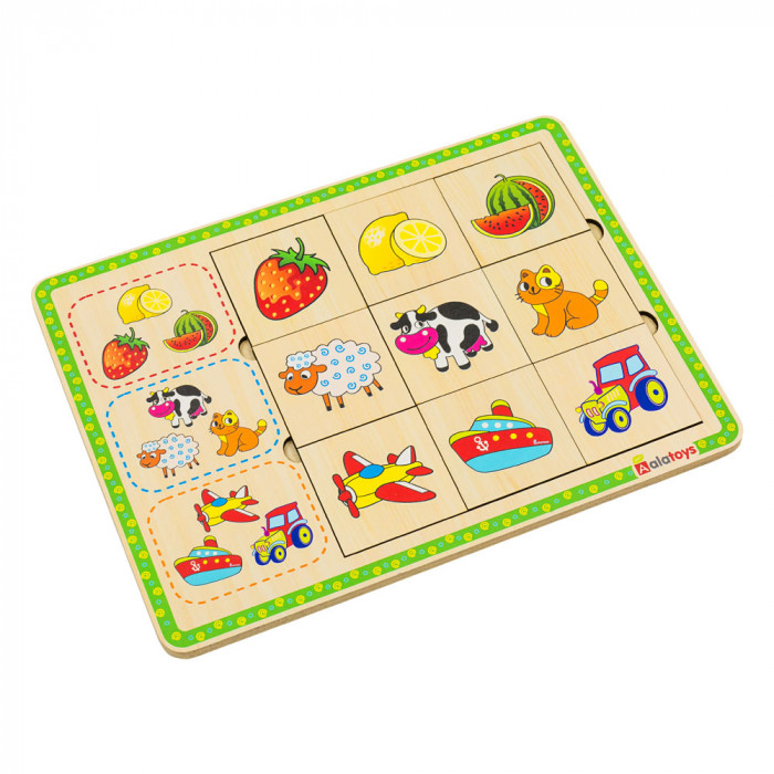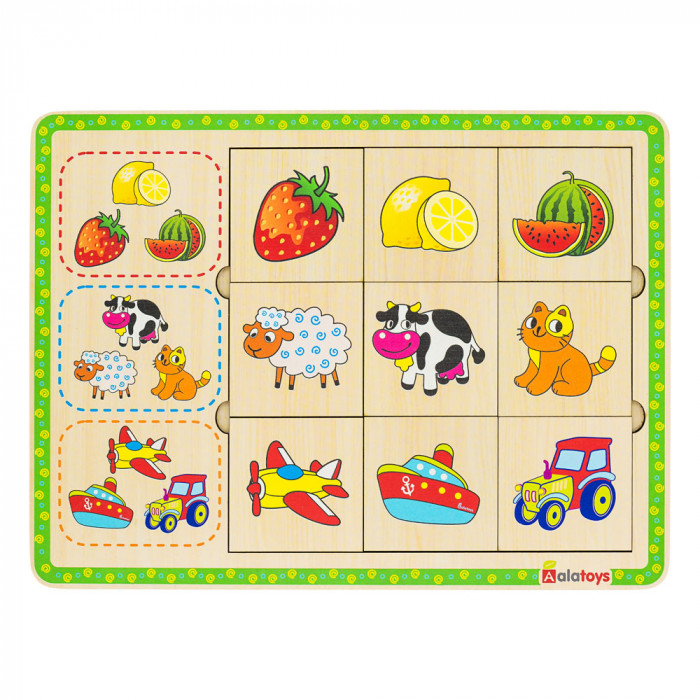 Задача этого пазла - определить, к какой группе предметов относится каждая картинка и правильно собрать логические ряды: фрукты/ягоды, животные, транспорт.