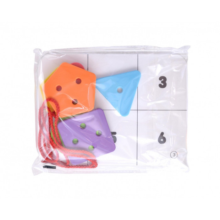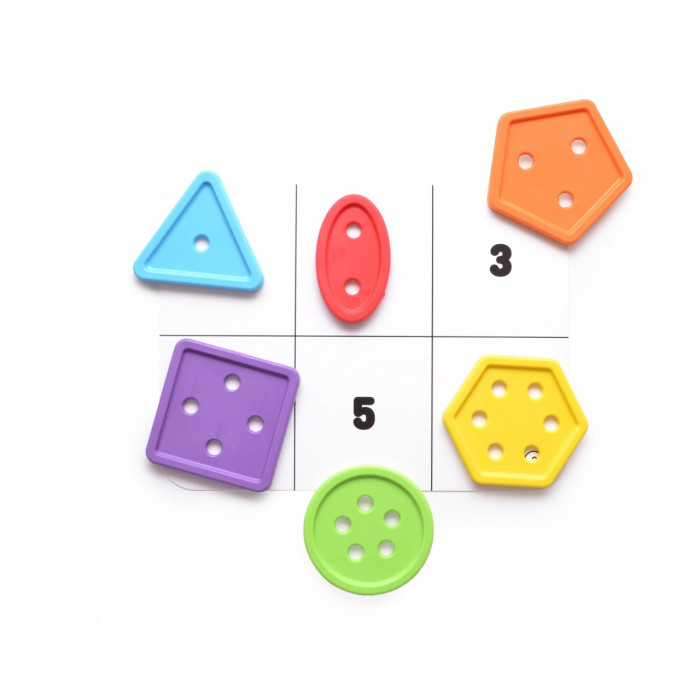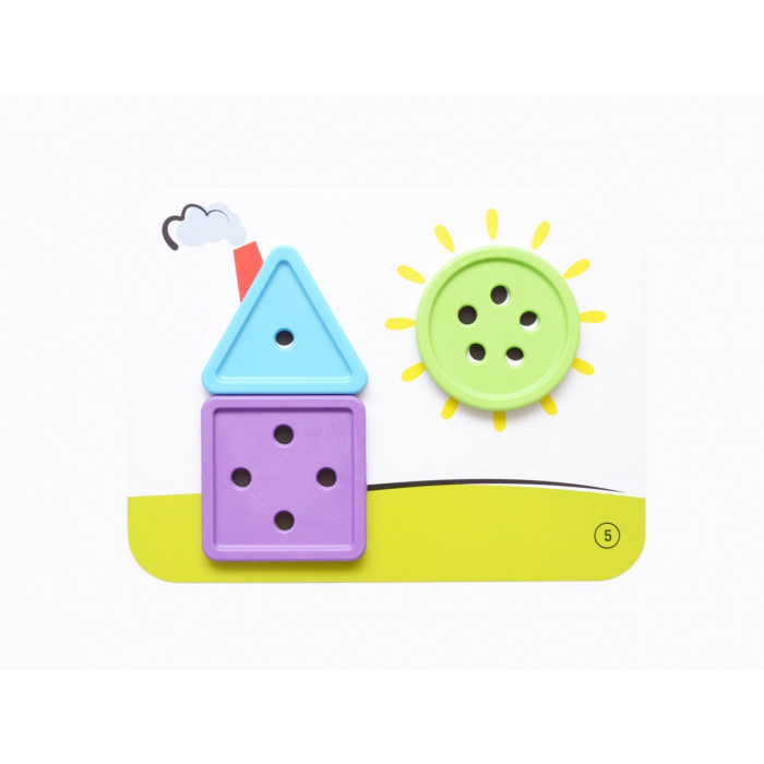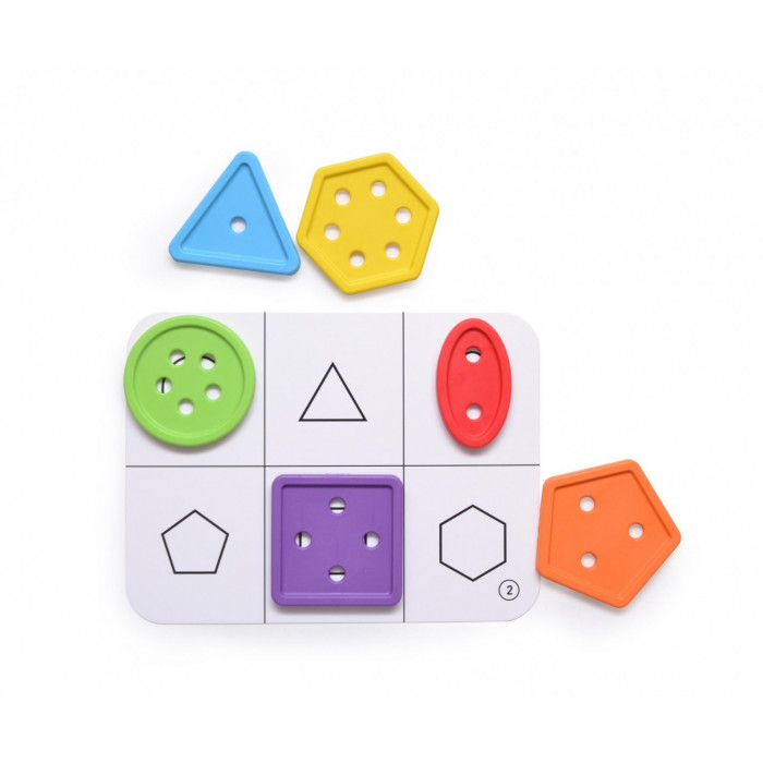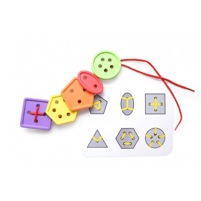 В комплект дидактического набора 2 уровня сложности входят "пуговки" различного цвета и формы, карточки с заданиями и шнурок.