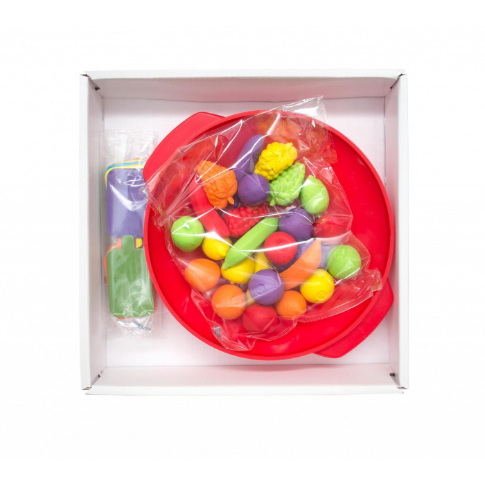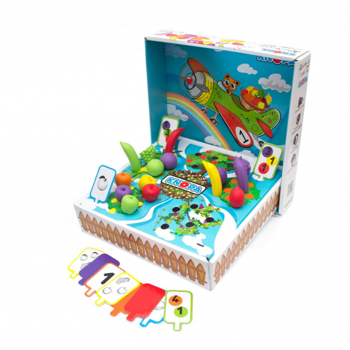 Игра укомплектована коробкой с игровым полем. Фигурками фруктов, цветными карточками и контейнером. Игровое поле поделено на 5 секторов (грядок) с равным количеством отверстий для овощей.