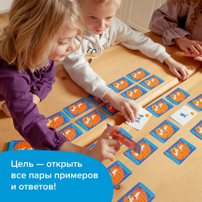 Любимая детьми игра на запоминание! На половине карт расположены примеры на сложение и вычитание, а на второй половине — соответствующие им ответы. Дети ходят по очереди и открывают по 2 карты, пытаясь найти пару.