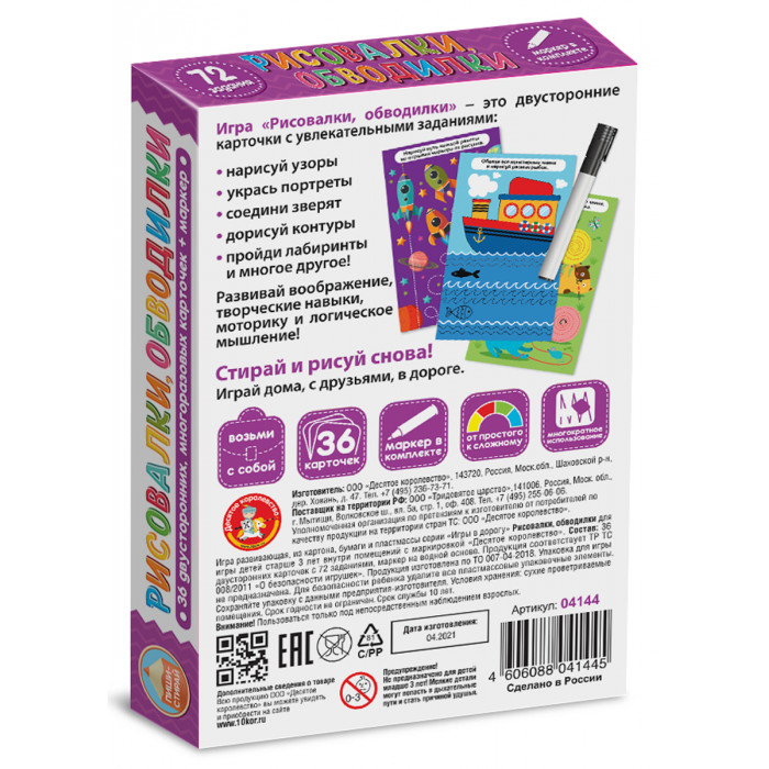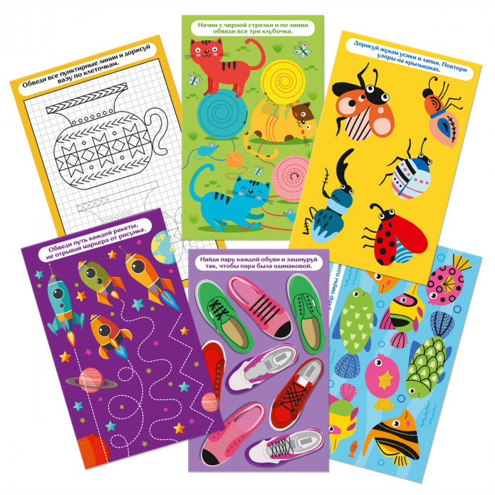 Соединяйте точки и обводите линии, создавая изображения от различных форм до веселых персонажей. Дорисовывайте фрагменты и увидите, что получится! Переходите от простых задач к более сложным. Не бойтесь ошибаться - маркер на водной основе легко стирается обычной салфеткой.