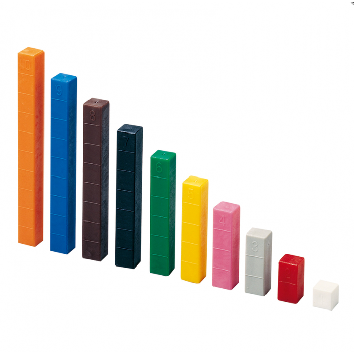 В составе набора 250 пластмассовых призм, которые отличаются по трем признакам: цвету, длине и числу, которое они обозначают.