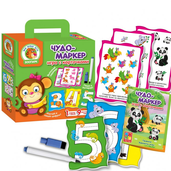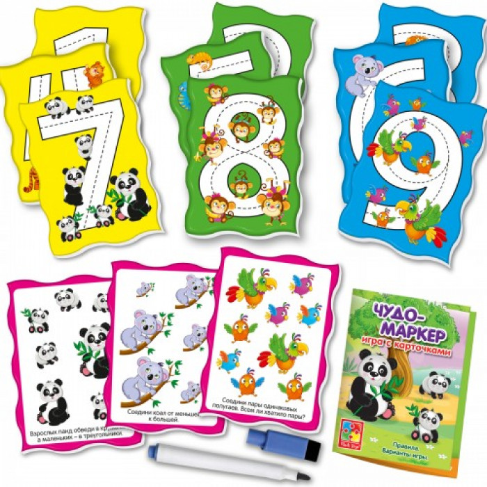 "Чудо-маркер" - увлекательная игра с карточками для малышей, с которой малыш научится писать цифры, разовьет речь и внимание.Особенности: плотные карточки и многоразовый маркер. Комплектация: двусторонние карточки - 9 шт., маркер с губкой - 1 шт., книжка-инструкция.