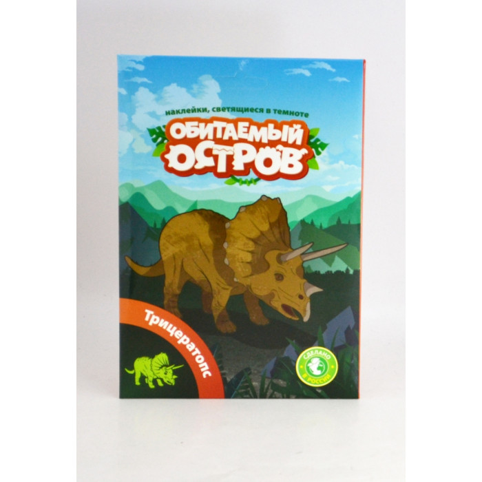 Набор включает в себя наклейку динозавра ТРИЦЕРАТОПС размером 110*135 мм, светящегося в темноте, цветную фигурку данного динозавра на специальной подставке и познавательную информацию о динозавре.