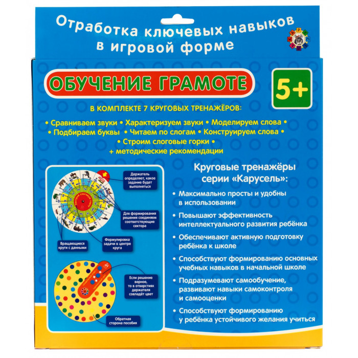 Тренажёры состоят из двух или трёх кругов, наложенных друг на друга. Круги прочно соединены в центре и легко вращаются. С помощью кругов ребёнок будет составлять слово из слогов, искать нужные звуки, определять буквы, и составлять слова.
