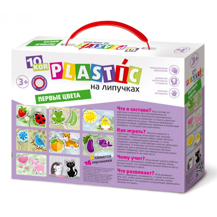 Игра научит ребенка, начиная с 3 лет, различать и запоминать основные 9 цветов. Играя, малыш узнает, что совершенно разные объекты могут быть одинакового цвета. Она развивает память, внимание, усидчивость, а также интеллект. Для того чтобы точно соединить липучки, нужно приноровиться — это развивает координацию движений и мелкую моторику.