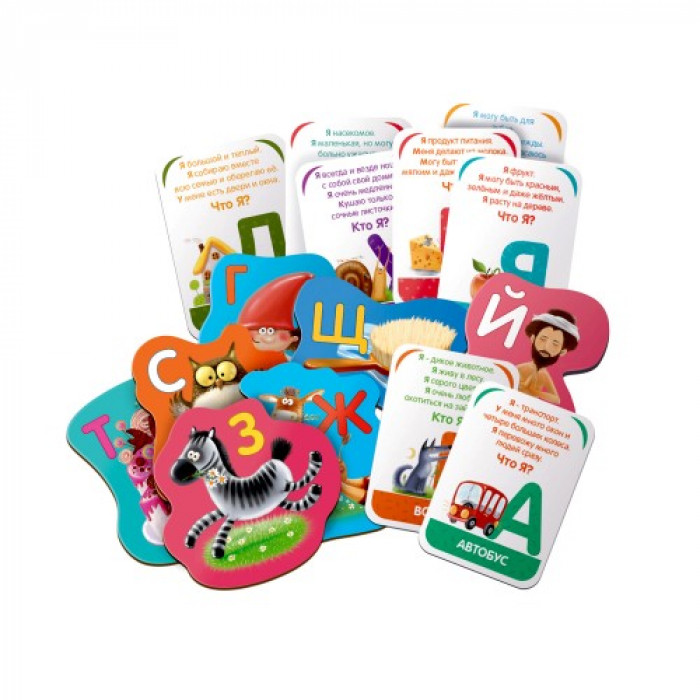 Игра содержит фишки с изображением букв и карточки со словами. Карточки содержат самые популярные слова на каждую букву и множество интересных фактов.