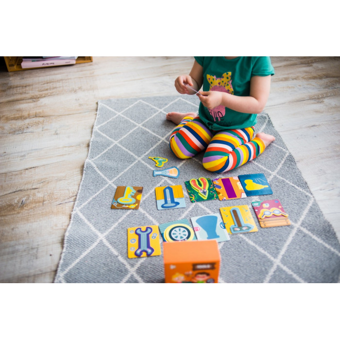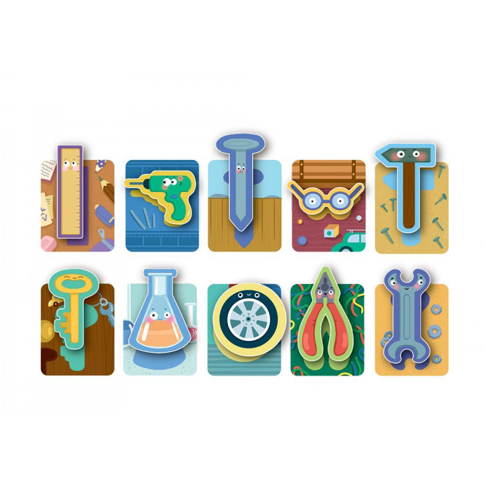 10 прямоугольных карточек-планшеток. На каждой из них имеется силуэт одного из инструментов: дрели, гаечного ключа, молотка, защитных очков и пр.
