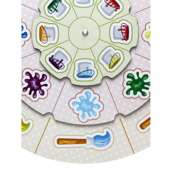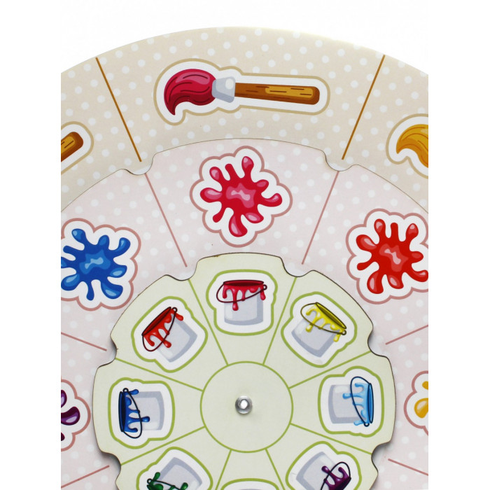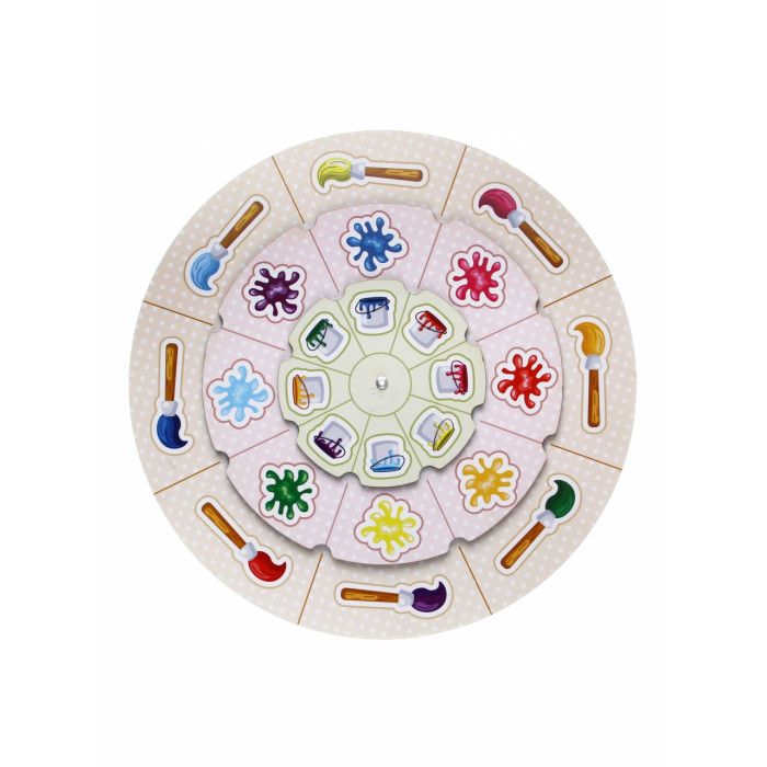 На нижнем кольце изображены кисточки с ворсом разного цвета, на среднем - кляксы разного цвета, а сверху - ведра с краской.