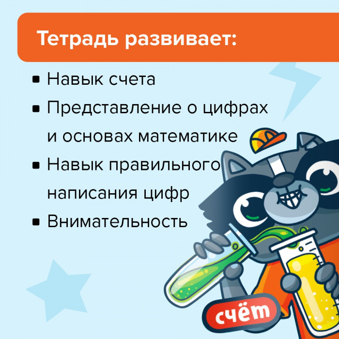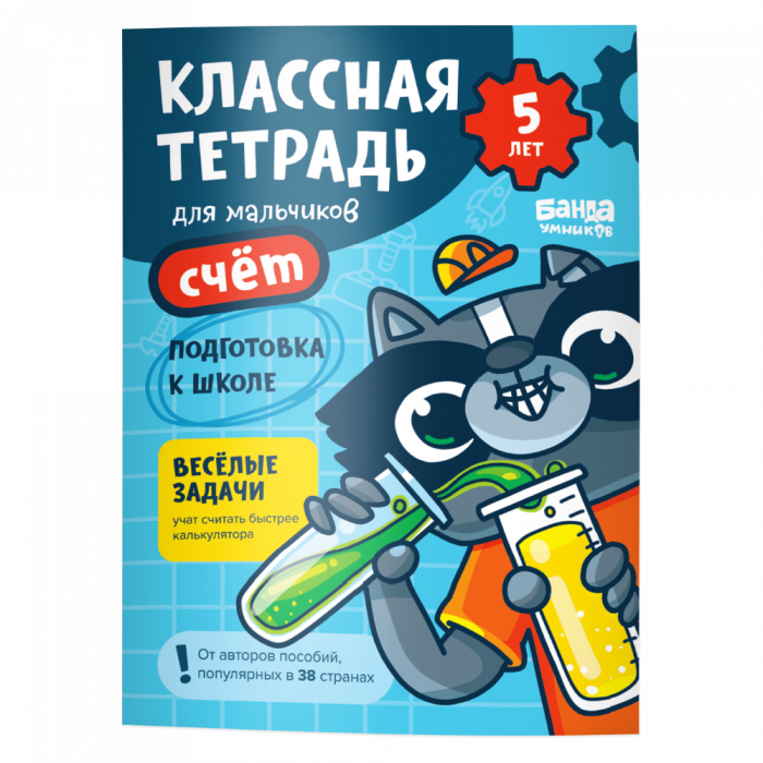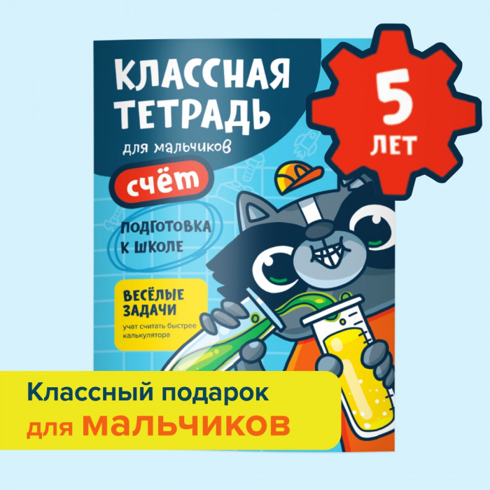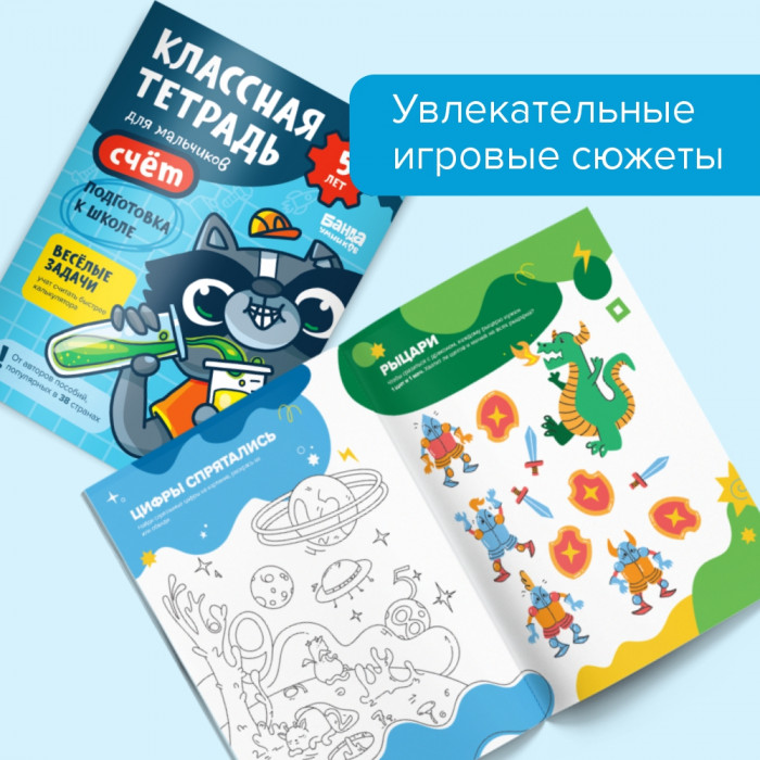 "Классная тетрадь. Счет для мальчиков 5 лет" предназначена для знакомства с цифрами и основами математики. Дети будут тренироваться в начертании цифр и формировать навыки счета. Все задания в "Классных тетрадях" сделаны так, чтобы дети учились считать легко и быстро. Ребенок знакомится с математическими понятиями с помощью наглядных примеров из реальной жизни. Например, мальчикам будет интереснее считать, сколько шайб забили команды или помочь рыцарю победить дракона с помощью математики. В тетрадях яркие иллюстрации и дружелюбные персонажи, которые помогут выполнить любое задание на сложение или вычитание легко и весело.