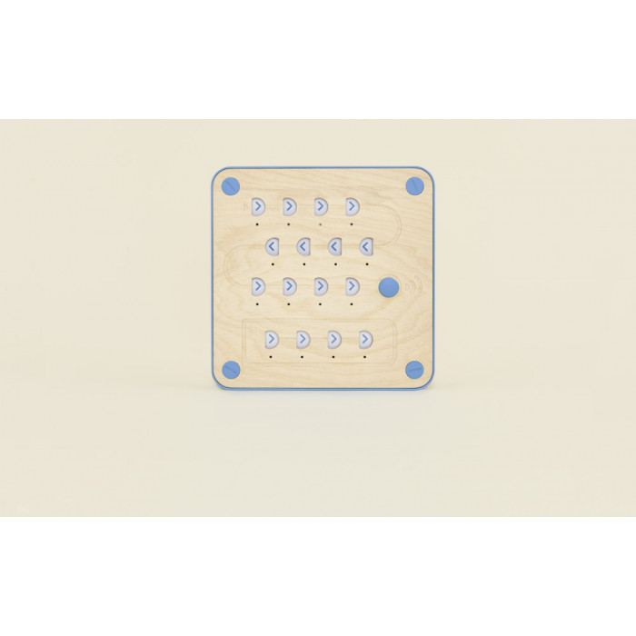 Интерфейсная доска для управления роботом Cubetto: расположите блоки на доске, чтобы сказать Cubetto, куда ему нужно идти. Нажмите синюю кнопку, и Cubetto выполнит вашу первую программу.