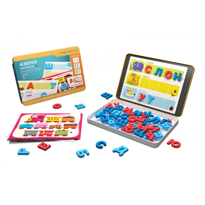 Специальное деление букв и цифр по цветам соответствует требованиям методических пособий для дошкольного образования детей. Металлическая коробка является игровым полем и местом для хранения. Основа элементов — магнитный винил, он крепко удерживает элементы на игровой поверхности. В набор входят красочные карточки с тематическими заданиями для изучения букв и обучения счету. На внутренней стороне металлической коробки можно рисовать маркером, надписи легко стереть.