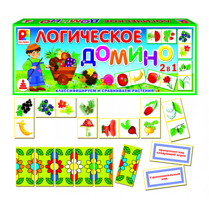 Это развивающее домино, которое в игровой форме научит детей классифицировать и сравнивать растения: овощи и фрукты, деревья и цветы, грибы и ягоды. Игра научит логически думать, разовьёт речь, внимание и память. На одной стороне фишек домино — растения (овощи, фрукты, ягоды, грибы и т. д.). Детям необходимо найти два растения одной группы и соединить фишки домино. Например: дуб подходит к берёзе, т. к. это деревья. А фишки с надписями внесут в игру дополнительный интерес. На другой стороне фишек домино — изображения половинок разных цветов. Детям необходимо найти одинаковые цветы и сложить целое изображение из фишек домино.