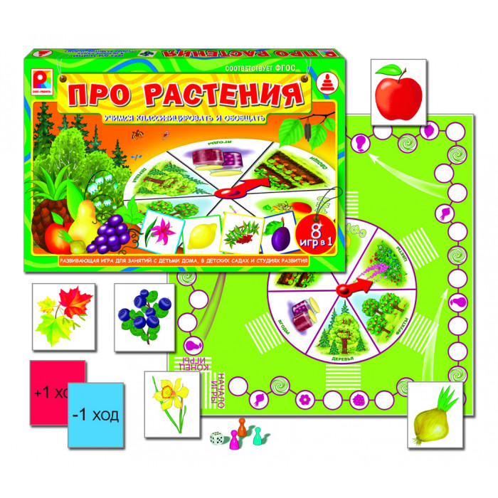 Развивающая многовариантная игра для детей дошкольного возраста. Она научит классифицировать растения по группам (овощи, фрукты, цветы и т. д.) и играть по правилам. А вращающаяся стрелка придает игре дополнительный интерес. Кроме основных вариантов игры, вам предлагается множество развивающих заданий с карточками и полем. На развитие речи, памяти и внимания.